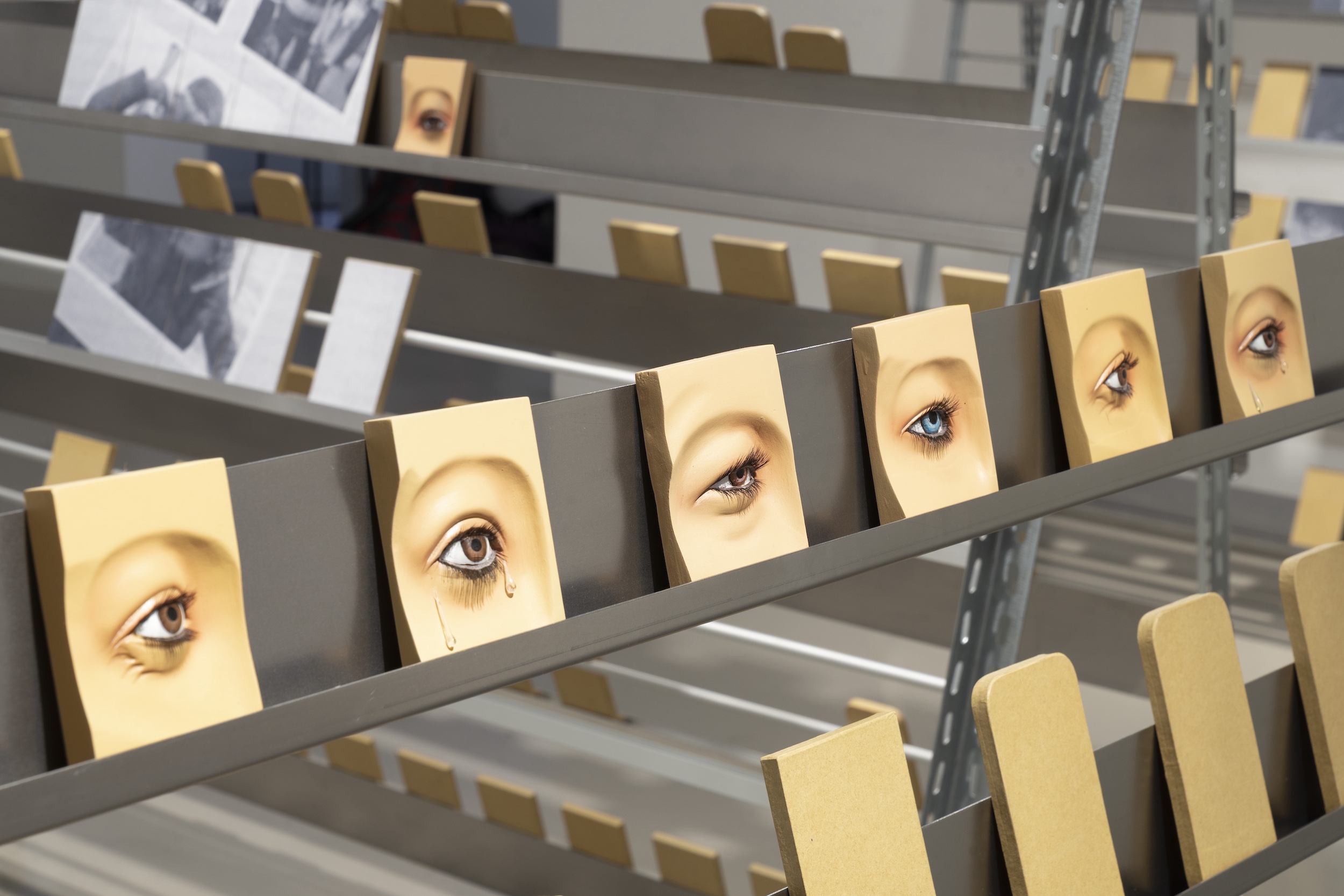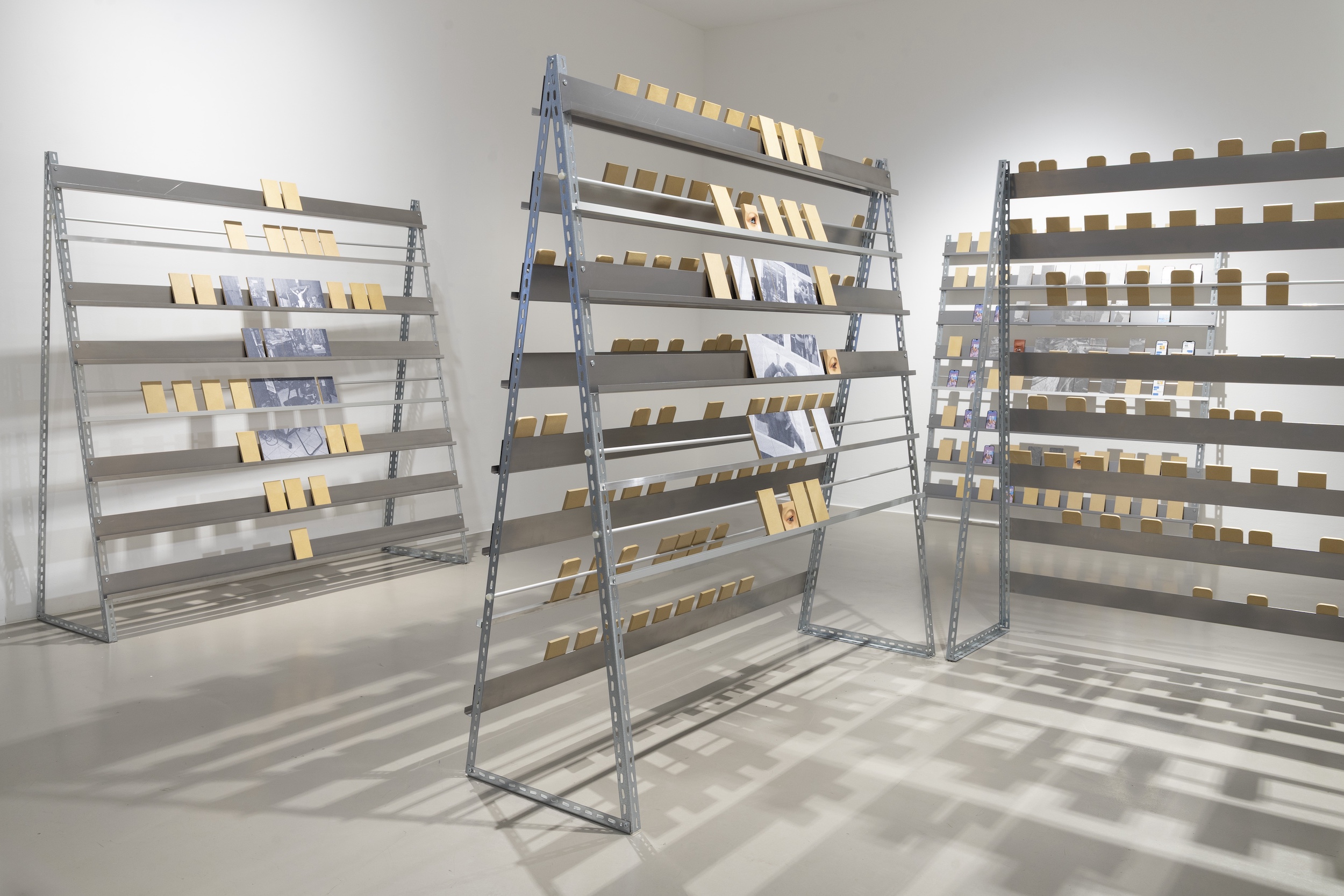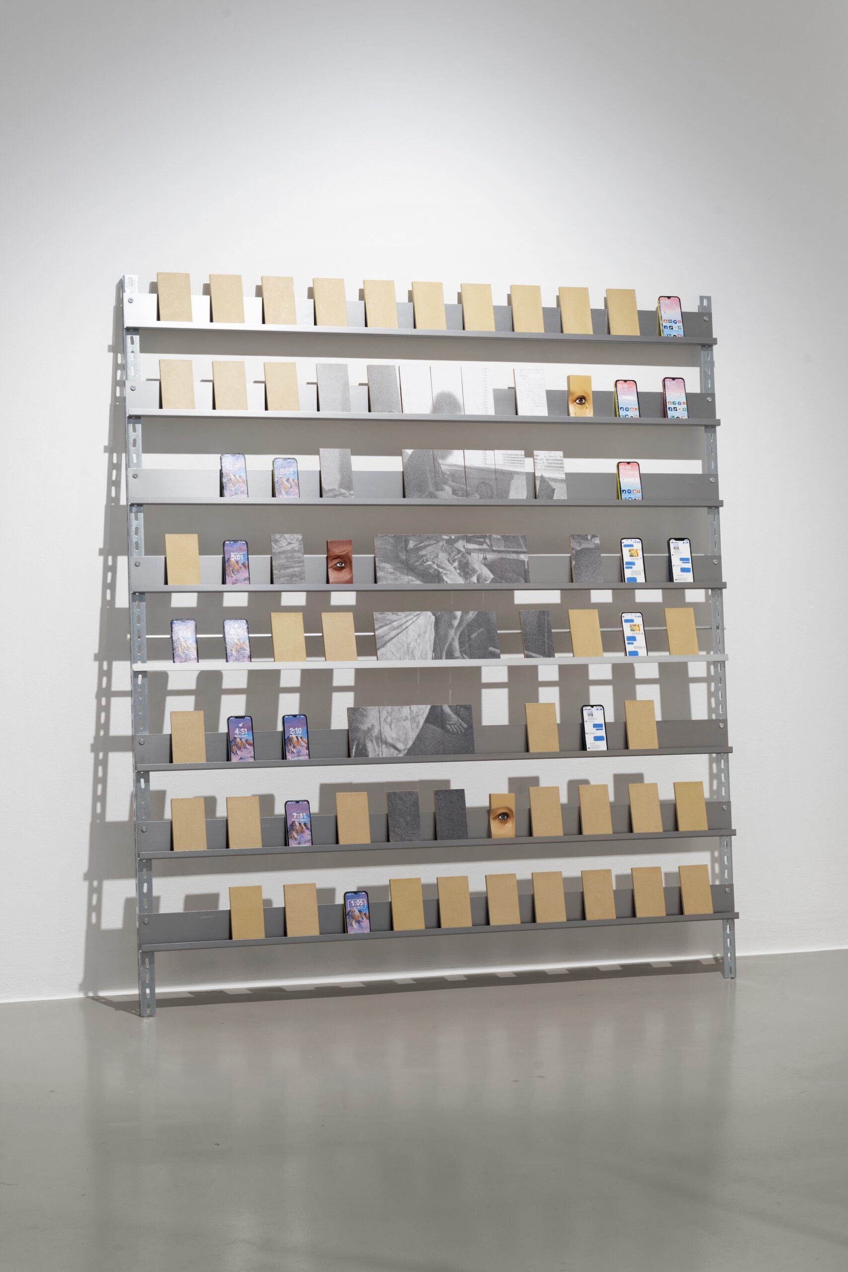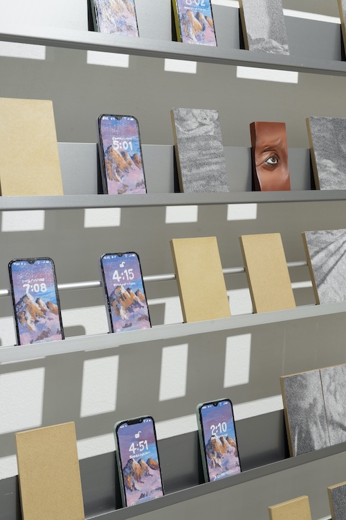 Werners Installation im Innenraum versammelt Regalstrukturen, auf denen Pappmaché Replikas von Handys platziert sind. Die mehrteilige Arbeit verweist auf die auf den Philippinen verbreitete Schattenindustrie der so genannten Klickfarmen. In den Klickfarmen bewegen sich Menschen zwischen ähnlichen Regalsystemen, um fortwährend Handys zu bedienen, Links zu klicken und Likes zu vergeben und so Einnahmen und Aufmerksamkeit zu generieren, an denen sie selbst nur wenig partizipieren. Einige der Pappmachéhandys in Werners Installation sind roh, andere zeigen Homescreens oder Chatverläufe, wiederum andere sind handgeschnitzt und blicken dreidimensional als Auge aus dem Regal. Sie verkörpern rituelle und religiöse Bezüge, verhandeln aber auch Nähe und Distanz. Das Handy und die digitale Kommunikation sind bei diasporischer Arbeit oft die einzige Möglichkeit, den Kontakt zu den Nächsten und zur Heimat nicht zu verlieren.