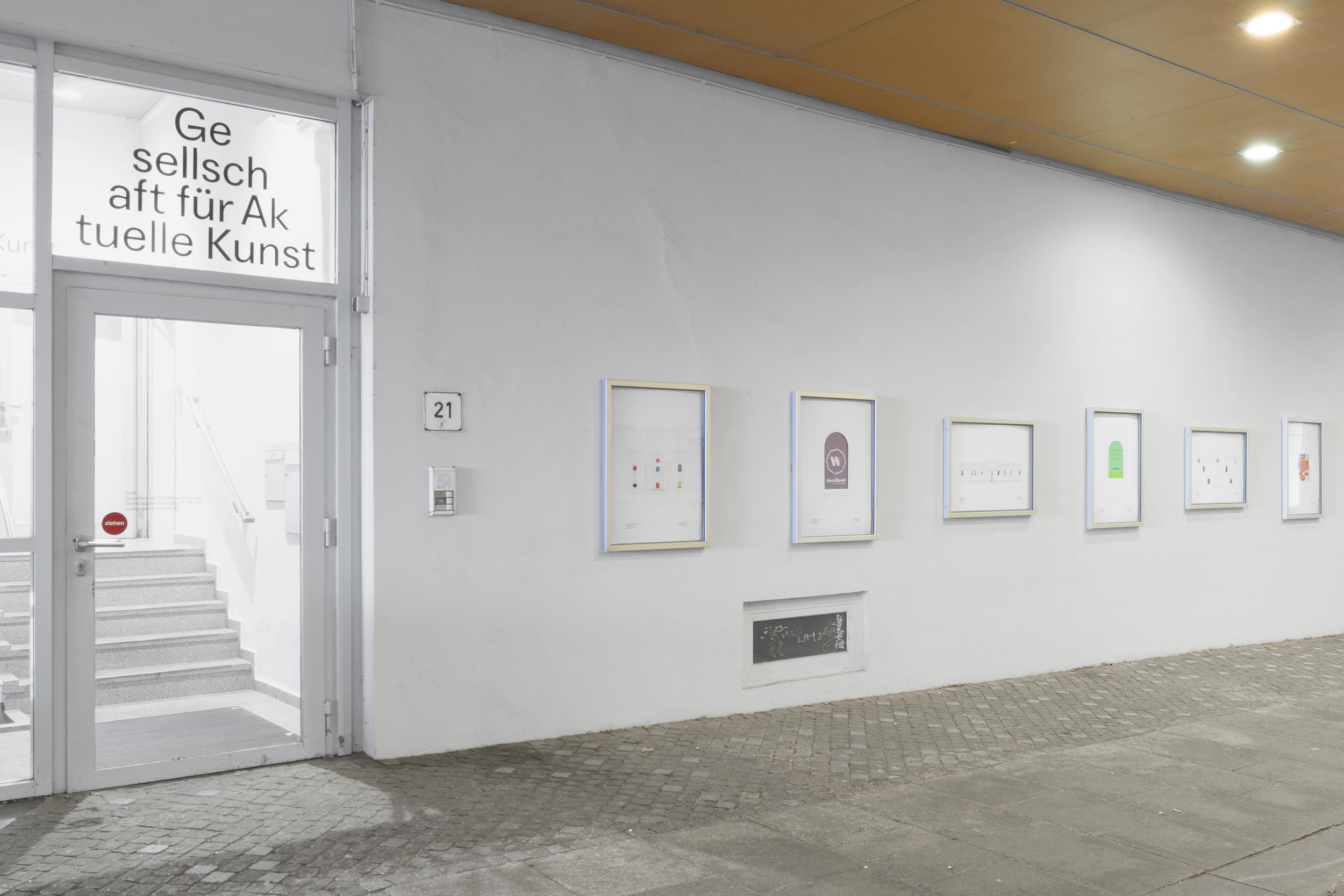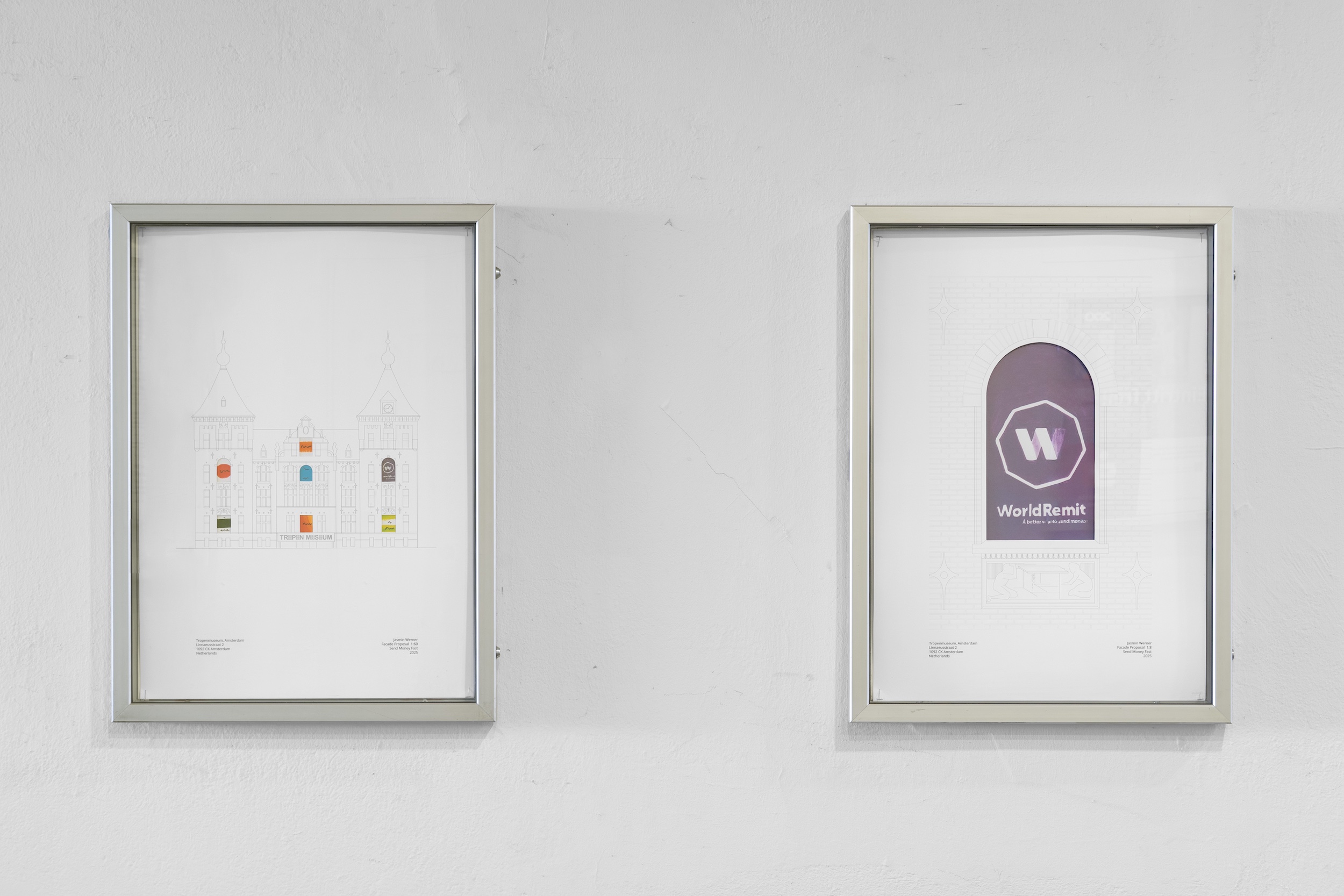 In den Posterrahmen zeigt Jasmin Werner Vorschläge, um die Gebäudefassaden bestehender Museen zu modifizieren. Während die jeweiligen Gesamtansichten der Museumsfassaden unverändert sind, hat sie in die Detailzeichnungen einzelner Fensterrolläden eingesetzt, welche händisch gemalte Werbung für Geldtransferfirmen zeigt. Repräsentative Architektur trifft so ganz unmittelbar auf die gegenwärtigen, alltäglichen Auswirkungen der extraktiven Praktiken, die mit den Sammlungen dahinter unmittelbar und mittelbar verknüpft sind. Als Orte der Erinnerung, des Wissens und der Repräsentation sind die Museen Räume, in denen Machtansprüche, Besitzverhältnisse und Selbstverständnis verhandelt und geformt werden. So bilden die Fassadenprogramme und die Fenstergestaltungen den architektonischen und den erinnerungspolitischen Rahmen für die globalgesellschaftlichen Bedingungen, aus denen sich Ria, Western Union, MoneyGram und Co. ableiten.