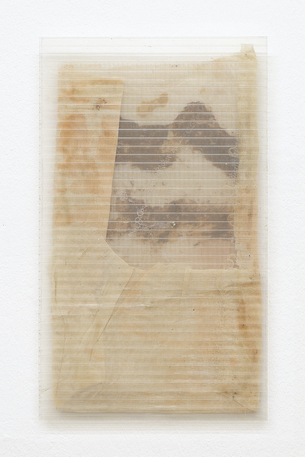 Kelly Weiss‘ Jahresgaben sind kleinformatige Polycarbonatplatten – sie schließen Stoffe in sich ein, pressen sie zusammen und werden von ihnen ummantelt. Was bei diesem Zusammenspiel entsteht, sind Bilder aus parallel verlaufenden Linien und fließenden Falten, aus Pigmenten und Rost, in die sich Zeit und Nutzung einschreibt. Durch die Platten scheinen sich kleine Fäden hindurch zu schlängeln, an wieder anderer Stelle setzten sich kleine Rückstände von Erde ab. Die Stoffe wiederum hatte Weiss zunächst mit Pigmenten bemalt und dann eine Zeit lang am Weserufer platziert, wo sie vom Rhythmus des tideabhängigen Flusses beeinflusst und mitbearbeitet wurden. Beide, Polycarbonatplatten und Malerei, tragen Spuren von Vergangenem und Erinnerungen an Orte in sich. Mit ihnen fängt Kelly Weiss vermeintlich unscheinbare Ausschnitte ein und rückt in Blick, was wir sonst vielleicht übersehen würden.