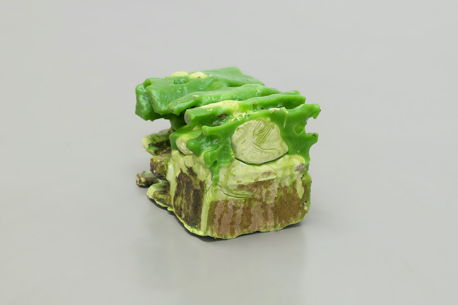 Für ihre Jahresgabe, die zur Werkserie der Distributors gehört, gießt Klaartje van Essen warmes, flüssiges Wachs zusammen mit kaltem Gips in Verpackungen aus Styropor oder Karton. Ihre Gussformen sind Überbleibsel, die weggeworfen wurden, die sie im öffentlichen Raum oder im Atelier findet und recycelt. Im Moment des Zusammentreffens reagieren die beiden Stoffe aufeinander: Sie stoßen sich ab, verbinden sich stellenweise und erstarren in einer Form, die weder ganz geplant noch völlig zufällig ist. Jede Arbeit ist dadurch ein einmaliges Ergebnis eines kurzen, intensiven Prozesses.