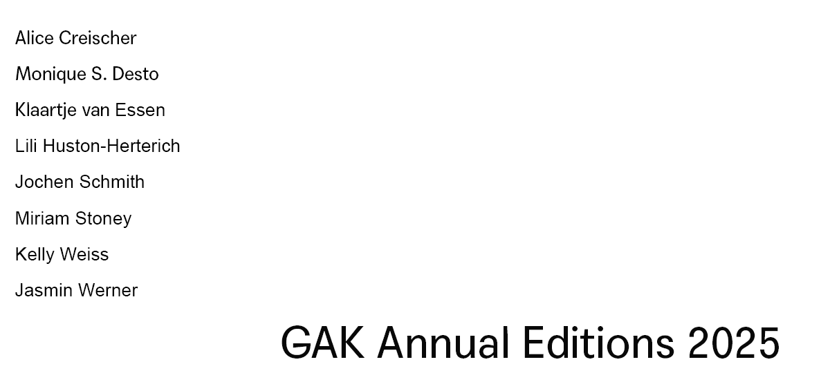 This year’s works are unique pieces and limited editions by Alice Creischer, Monique S. Desto, Klaartje van Essen, Lili Huston-Herterich, Jochen Schmith, Miriam Stoney, Kelly Weiss and Jasmin Werner. All of them exhibited at the GAK in 2025 and are thus directly related to our programme. We will be presenting the annual editions in our library during opening hours and from 29 November 2025 to 11 January 2026.