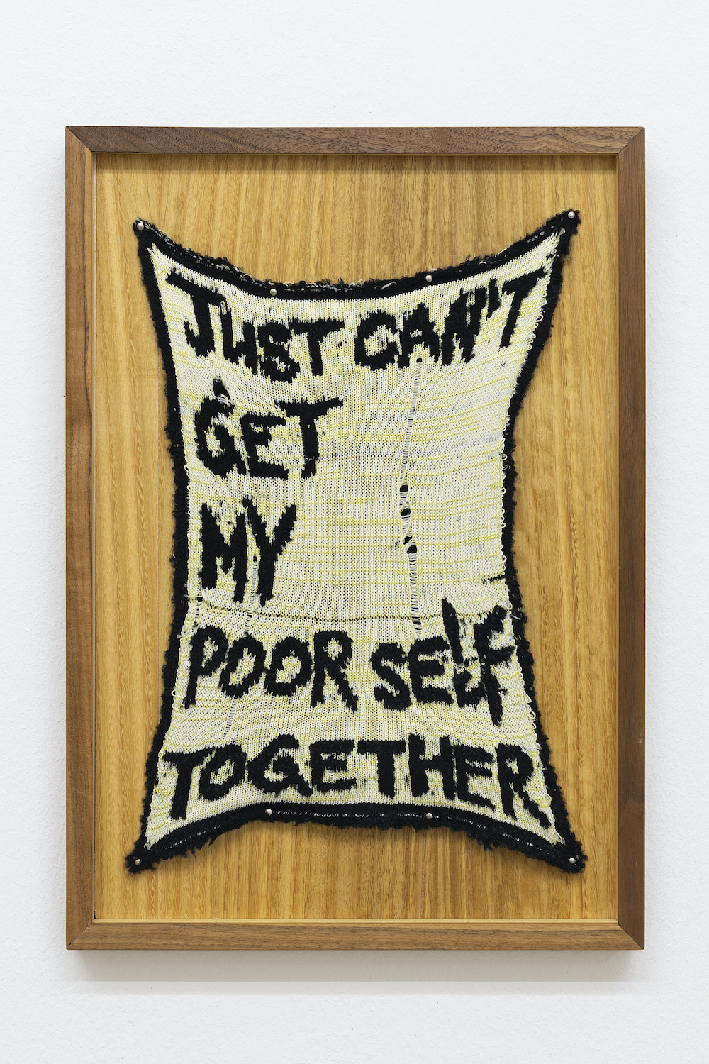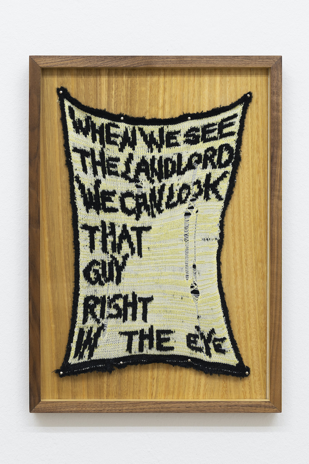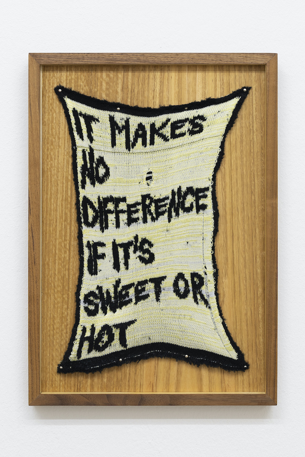 Knitted words—in some places they seem quite frayed—tell us that it makes no difference whether it’s sweet or hot, the poor self or about the encounter with the landlord. What reads like comments taken from everyday life are in fact lines from song lyrics that accompany the stock market news on a US radio show. The choice of song—whether it is “We’re in