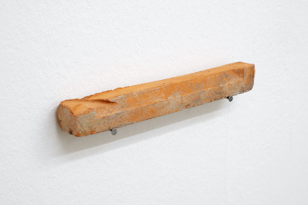 During a visit to her father’s home in Scunthorpe, England, Miriam Stoney created a brick sculpture shaped as a corner for an exhibition in Paris. Its dimensions are based on the length between the artist’s elbow and her middle finger. The bricks she used did not fit this physical measurement and so had to be adapted and cut with an angle grinder. A scrap from this process, which she calls My First Flex, is Stoney’s annual gift to the GAK.